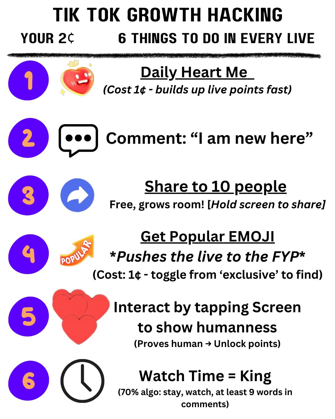 A: Run the 6-step loop: hearts, comments, shares, emoji, taps, watch time.